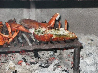 In the dead of winter under an avalanche of snow, this reminds me of the good meals to come. We like to roast lobsters on a rack inside our wood oven. (Priscilla took this photo in September.) First I preheat the grill. Then I place the lobsters, cut side down, on the rack. This seems counter intuitive but the heat sears the lobster meat sealing in the juices. Once the lobsters are flipped over their shells contain the juices and lemon herb butter we use to baste them.